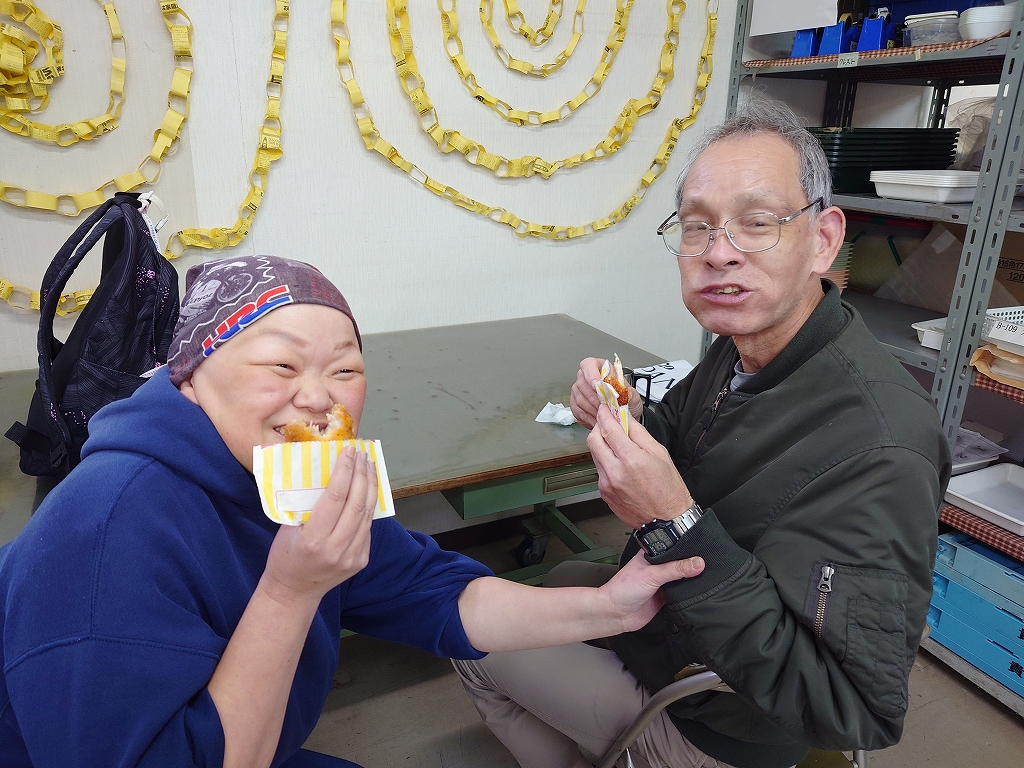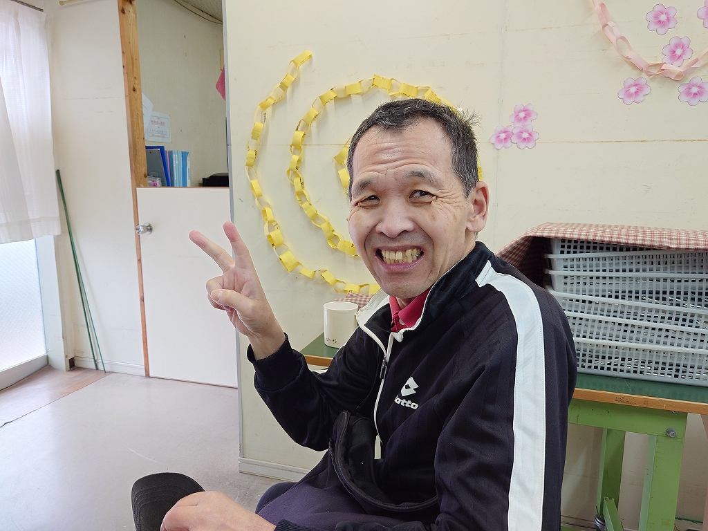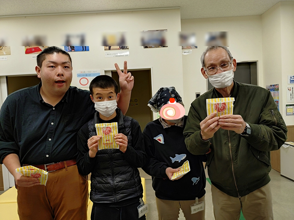 新館の清掃員にお届け。お祝いの言葉をもらいニッコリ😊笑顔です。